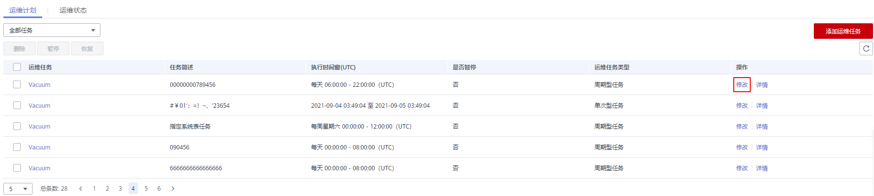 弹出修改运维任务边栏,修改运维任务功能与添加运维任务功能保持一致,详情请参见添加运维计划。