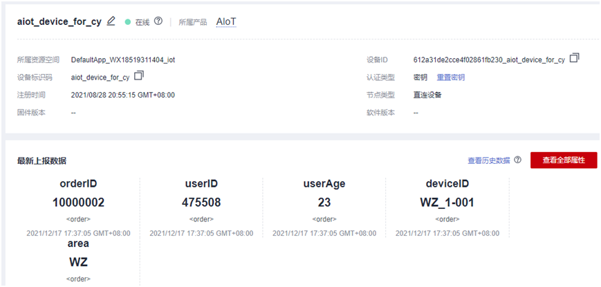 规则描述:数据转发至DIS服务,数据来源:设备属性,触发事件:自动匹配“设备属性上报”。