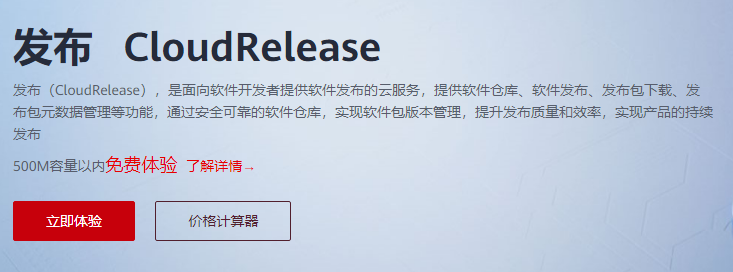 - 进入“发布服务”首页https://www.huaweicloud.cn/product/cloudrelease.html点击“立即体验”进入“私有依赖库”