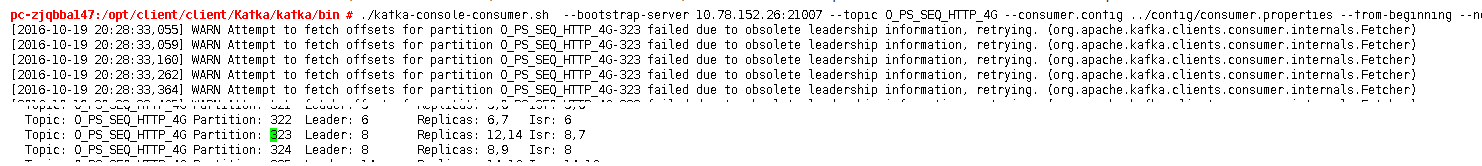 通过Kafka自身携带的console-consumer进行数据消费,可以发现元数据紊乱,导致consumer无法正常消费,提示fetch offsets for partition failed due to obsolete leadership infomation。