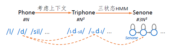 图2 Phone、Triphone、Senone三者之间的关系(#N、# 、#3 表示数量级)