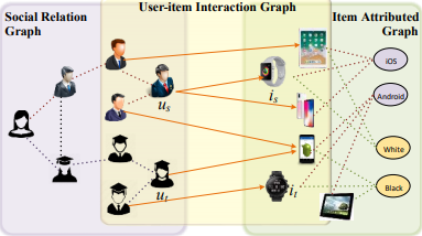 在推荐系统中,至少有两个单部图需要考虑,即用户社交关系网络和产品的共现关系网络或会话图。在社交关系图中,用户的偏好和购买行为会互相影响,产品的共现关系不仅体现了产品的互补或者竞争的关系,也显示了用户的消费模式,这些都是在做推荐的时候需要考虑的因素。