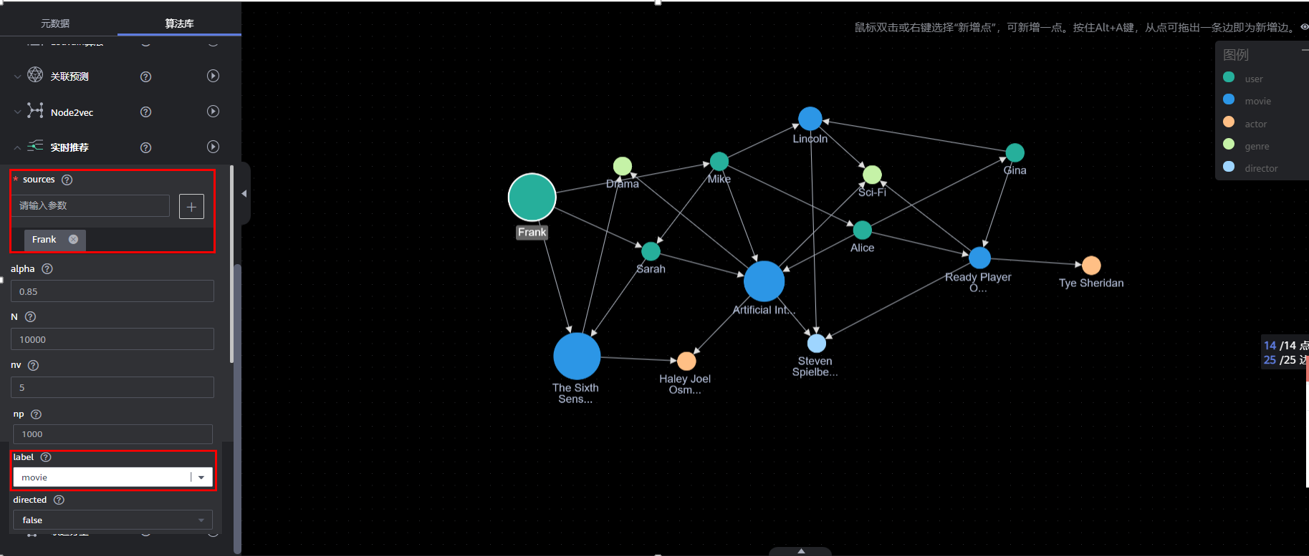 这是一个异构图的例子,包含user,movie,genre,actor,director等实体,我们想向Frank推荐电影,我们利用GES内置的实时推荐算法来实现。实时推荐算法是一种基于随机游走模型的算法,主要的输入参数是sources和label,sources表示请求节点的id,label表示期望得到的推荐的节点类型,具体的参数说明可以参考链接实时推荐算法,返回参数中,score展示了各节点的推荐值,反应了对其推荐程度。