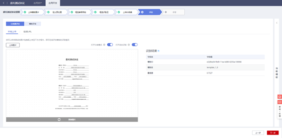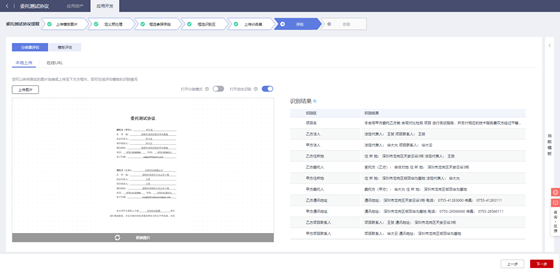 标注好每一张模板后我们需要进行一个分类器的训练,用来自动区分某一页合同是多模板中的哪一个模板。本文我们所示的案例中仅存在五张模板,且不同模板间差异较大,分类任务比较简单,所以可以选择不上传训练集直接使用模板图做训练集开始分类器训练。完成训练后,工具会自动跳转到了评估页面,此处我们,可以测试一下分类器是否能够准确的对数据进行分类,也可以打开动态识别看我们制作的模板是否把行信息提取出来。