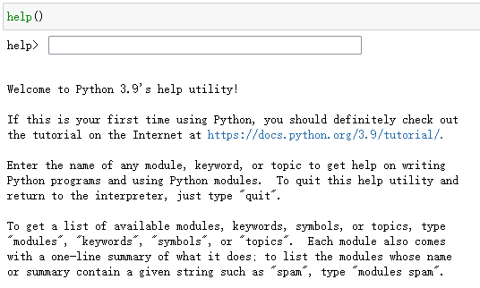 第一个是 help(),该函数用来查看编程对象的帮助手册,例如下述代码