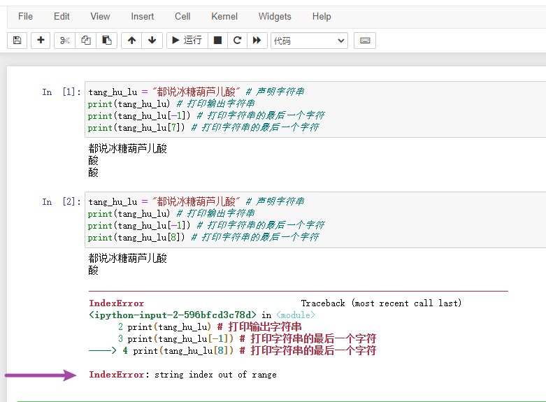 上述代码就实现了,注意中括号里面的数字 [-1] 就是倒着数最后一个,当然你可以顺着数,数到 7 就是第八个山楂了,这里尝试把 7 修改成 8 ,看一下会报什么错误吧。