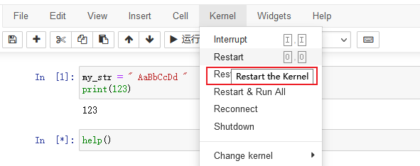 在 jupyter 的使用过程中,如果出现了 In [*],表示命令没有执行完毕,需要点击菜单栏的 Kernel,然后重启服务。