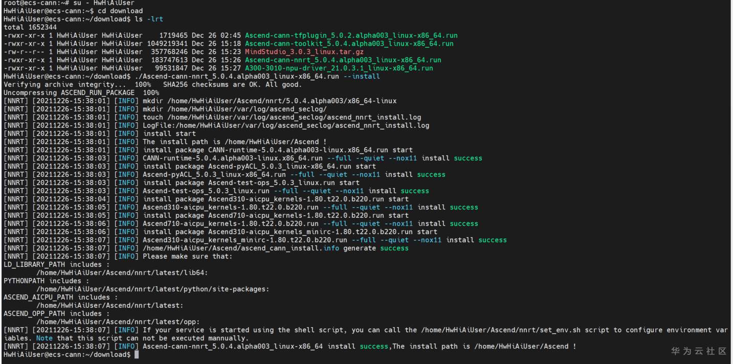 [NNRT] [20211226-15:38:07] [INFO] Ascend-cann-nnrt_5.0.4.alpha003_linux-x86_64 install success,The install path is /home/HwHiAiUser/Ascend !
