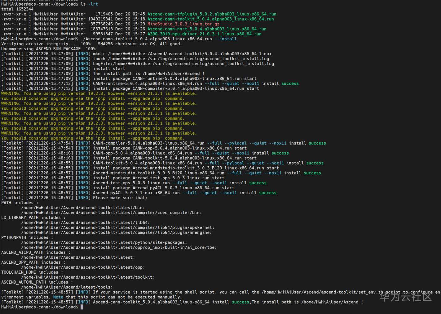 [Toolkit] [20211226-15:48:57] [INFO] Ascend-cann-toolkit_5.0.4.alpha003_linux-x86_64 install success,The install path is /home/HwHiAiUser/Ascend !