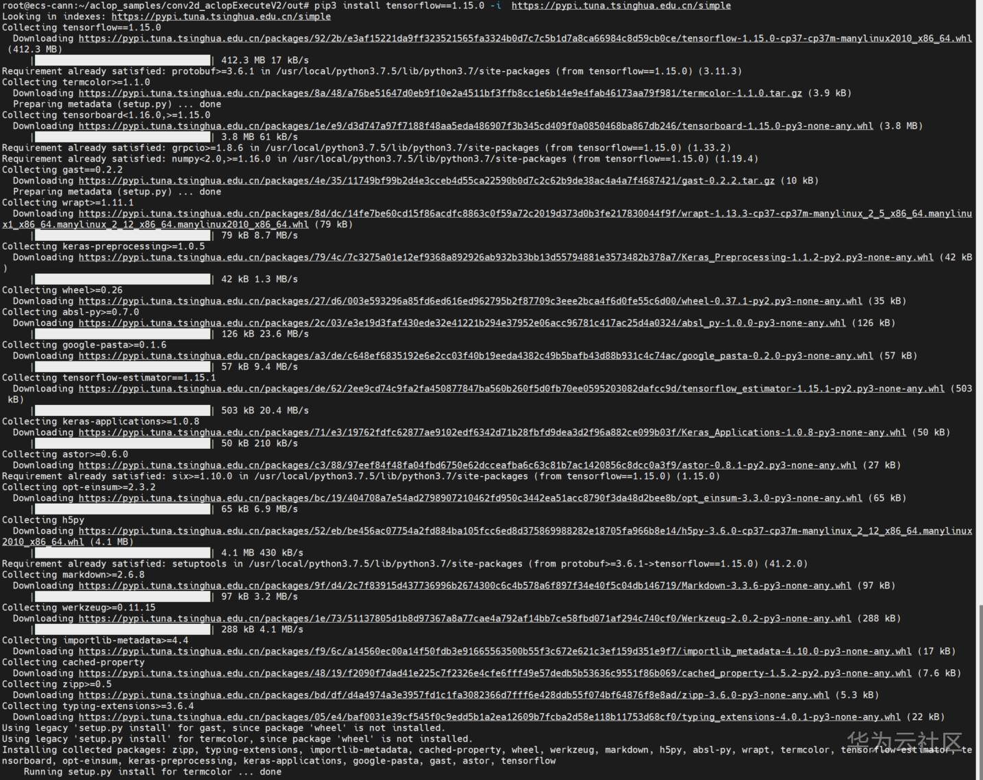 但是这个下载的速度往往会很慢,所以可以暂停掉这个脚本,手工指定pip源安装tensorflow1.15.