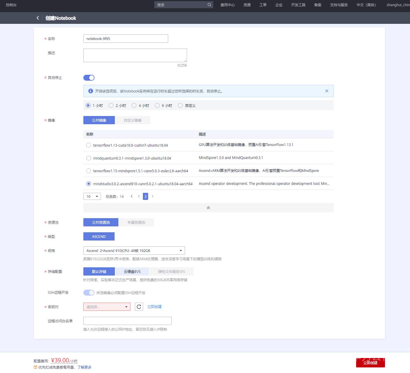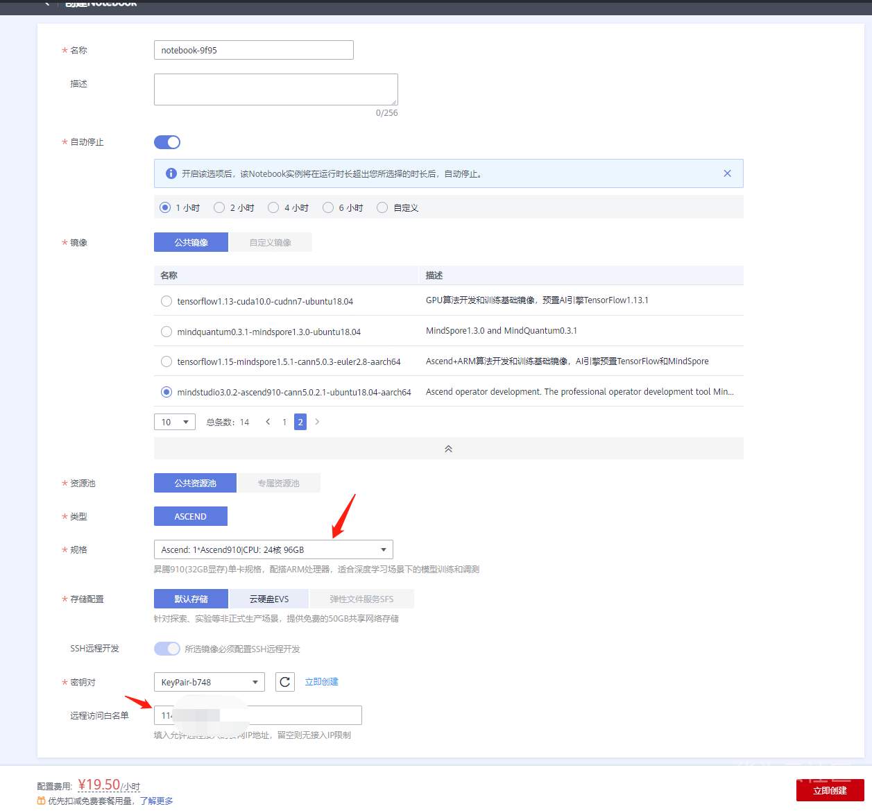 选择公共镜像中第二页的最后一个: mindstudio3.0.2-ascend910-cann5.0.2.1-ubuntu18.04-aarch64