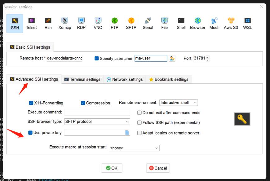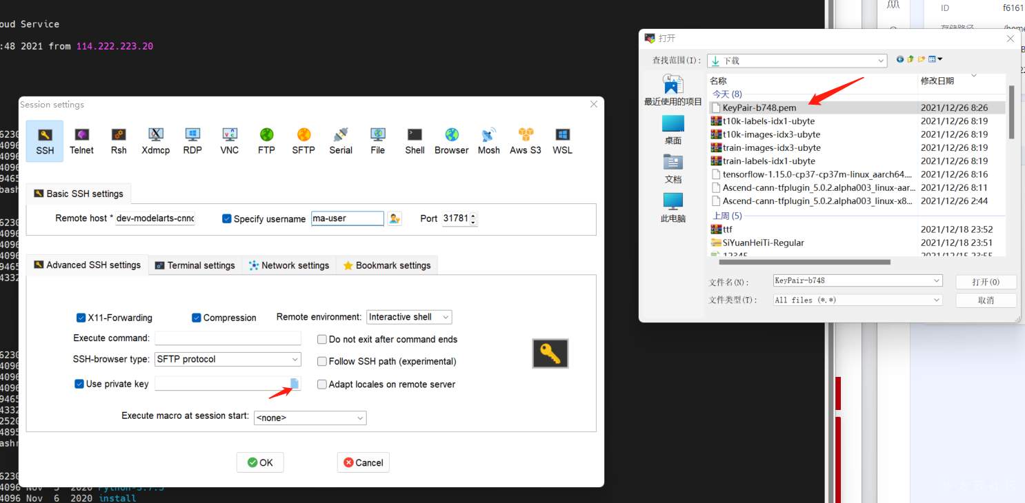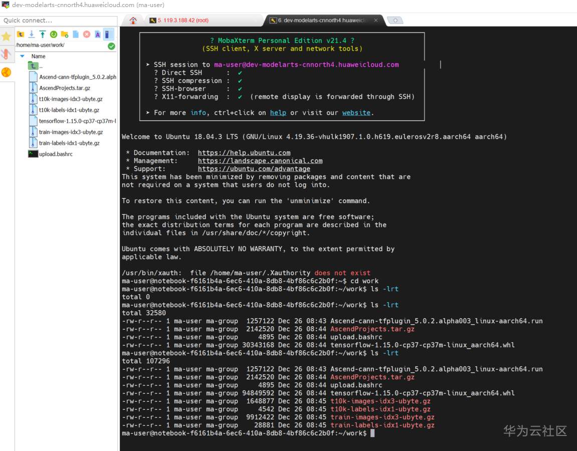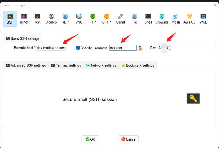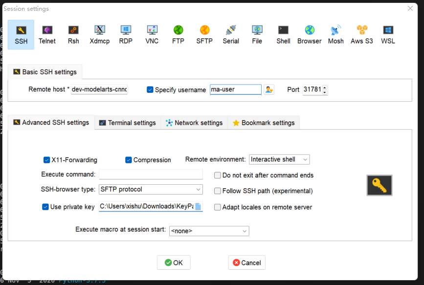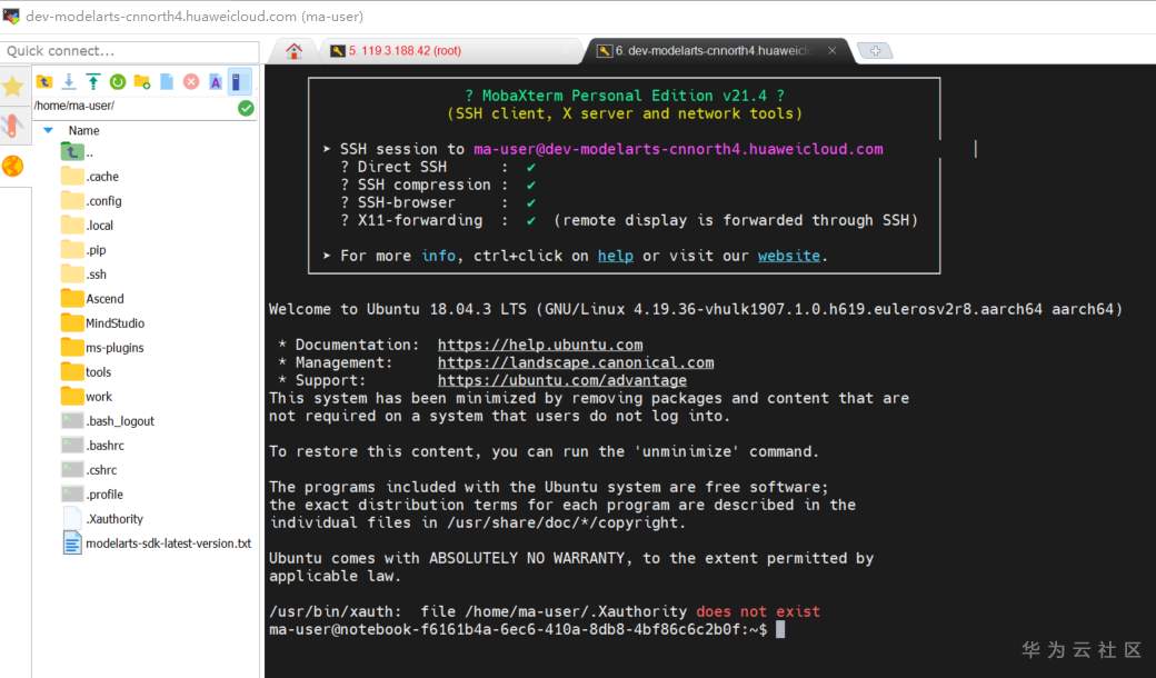三、完成MobaXTerm与ModelArts服务器的连接: