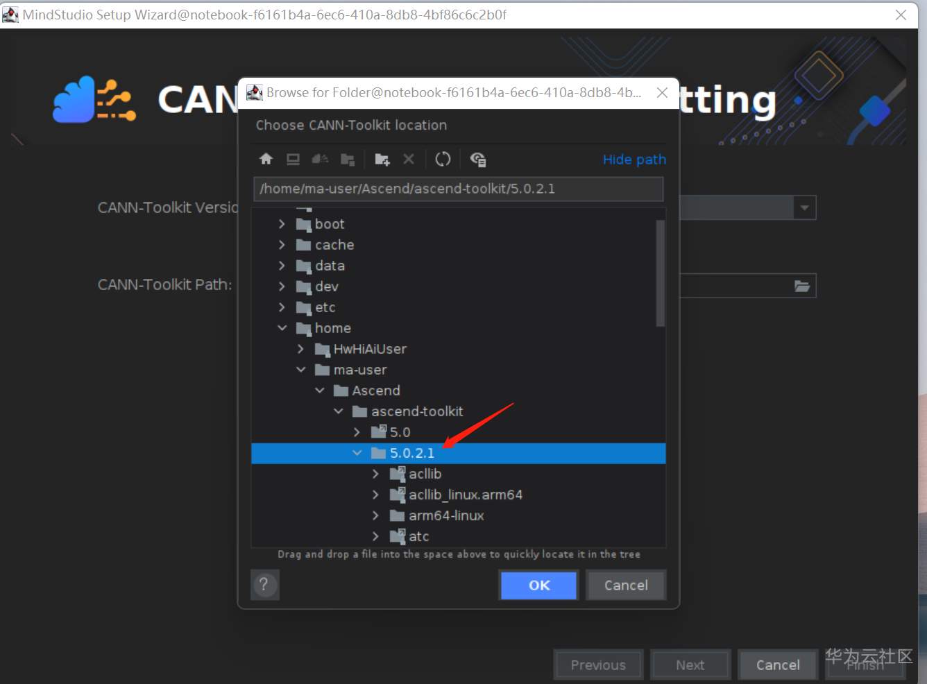 选择 /home/HwHiAiUser/Ascend/ascend-toolkit/5.0.2.1目录,点击OK