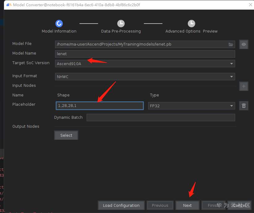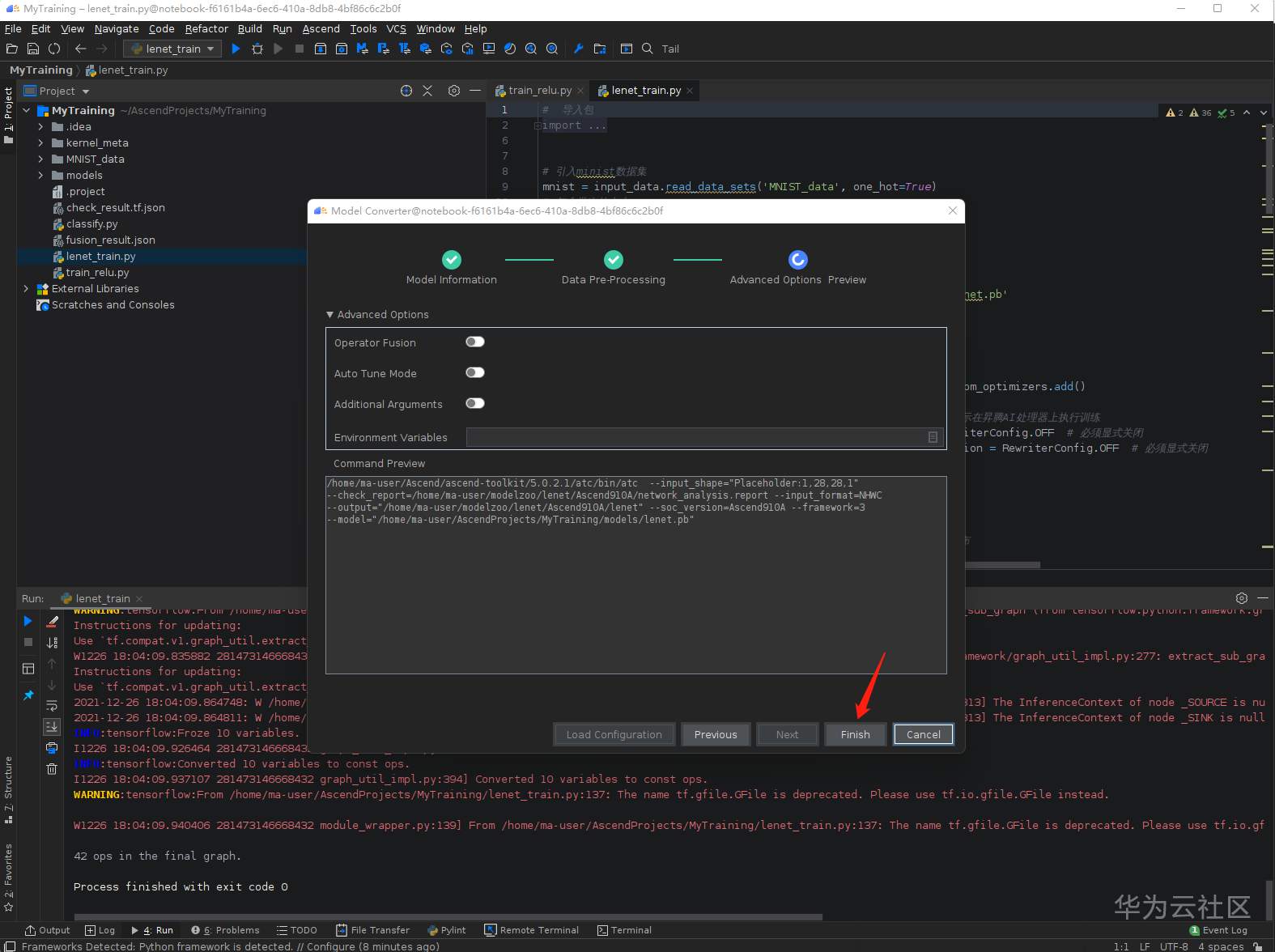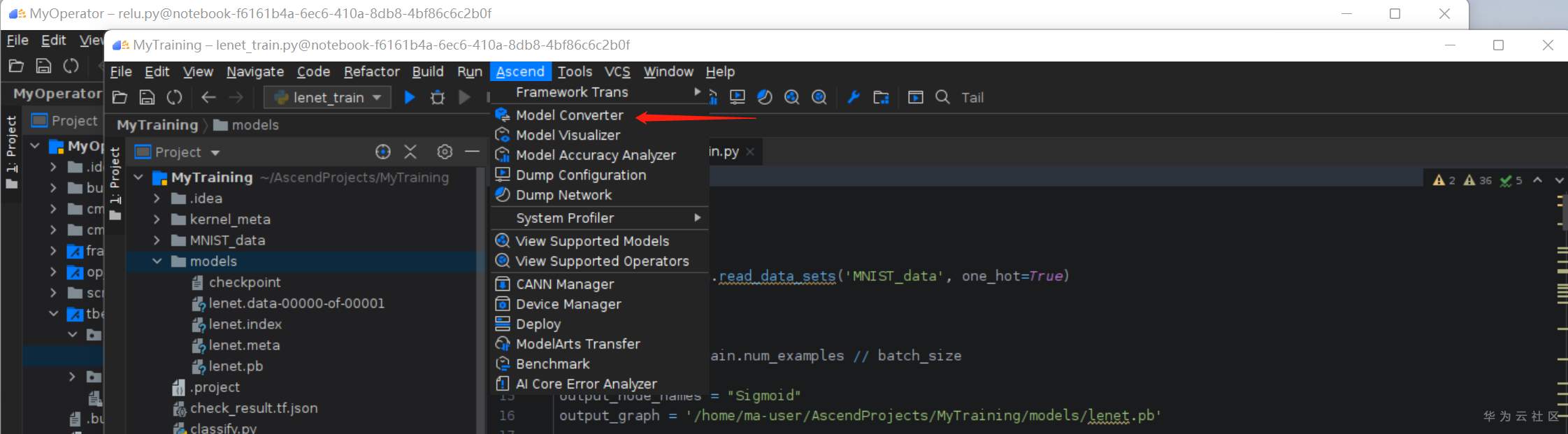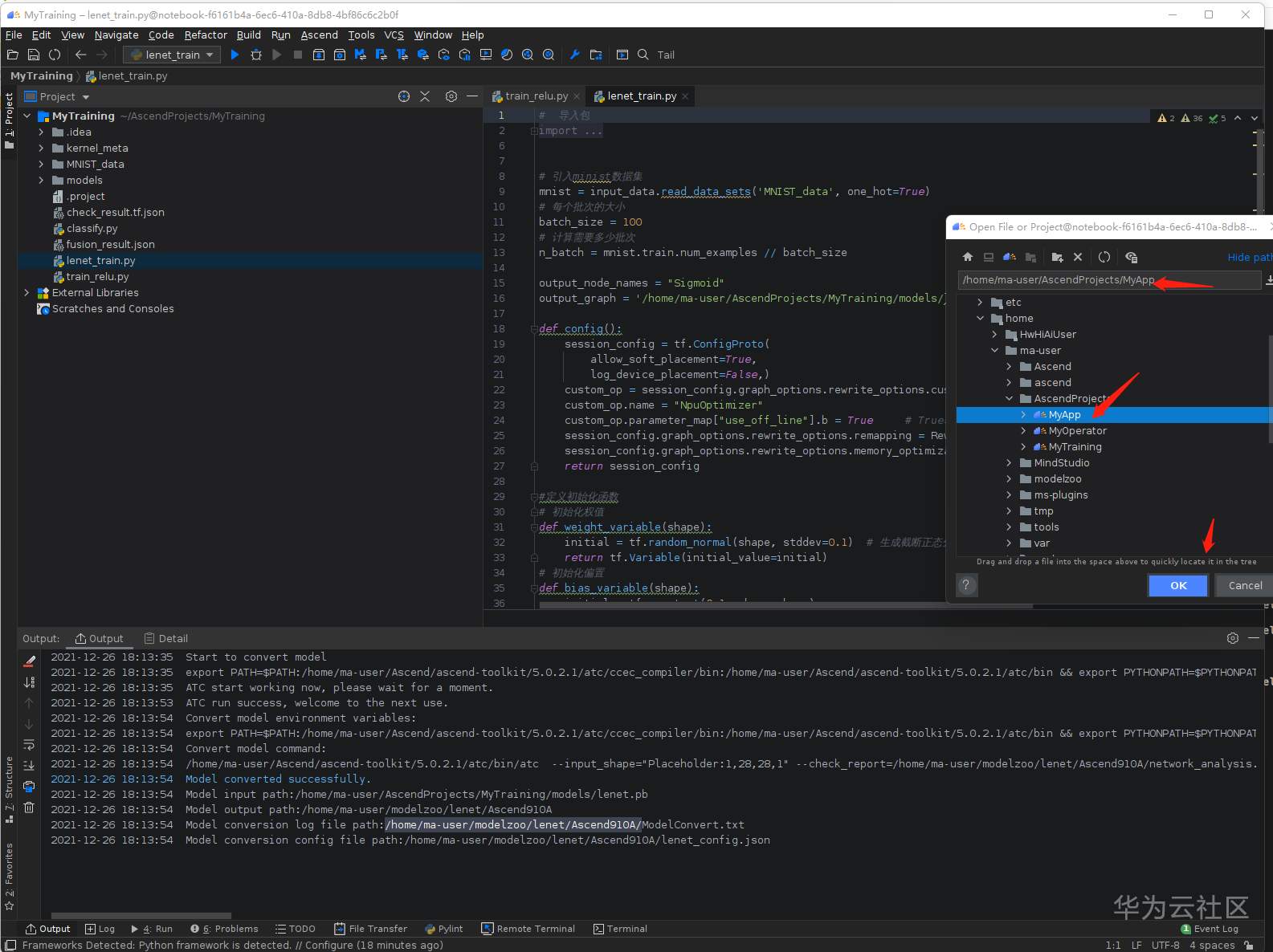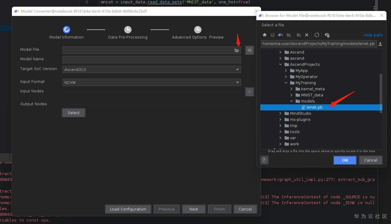弹出的文件夹选择 /home/ma-user/AscendProjects/MyTraing/models/lenet.pb文件,点击OK: