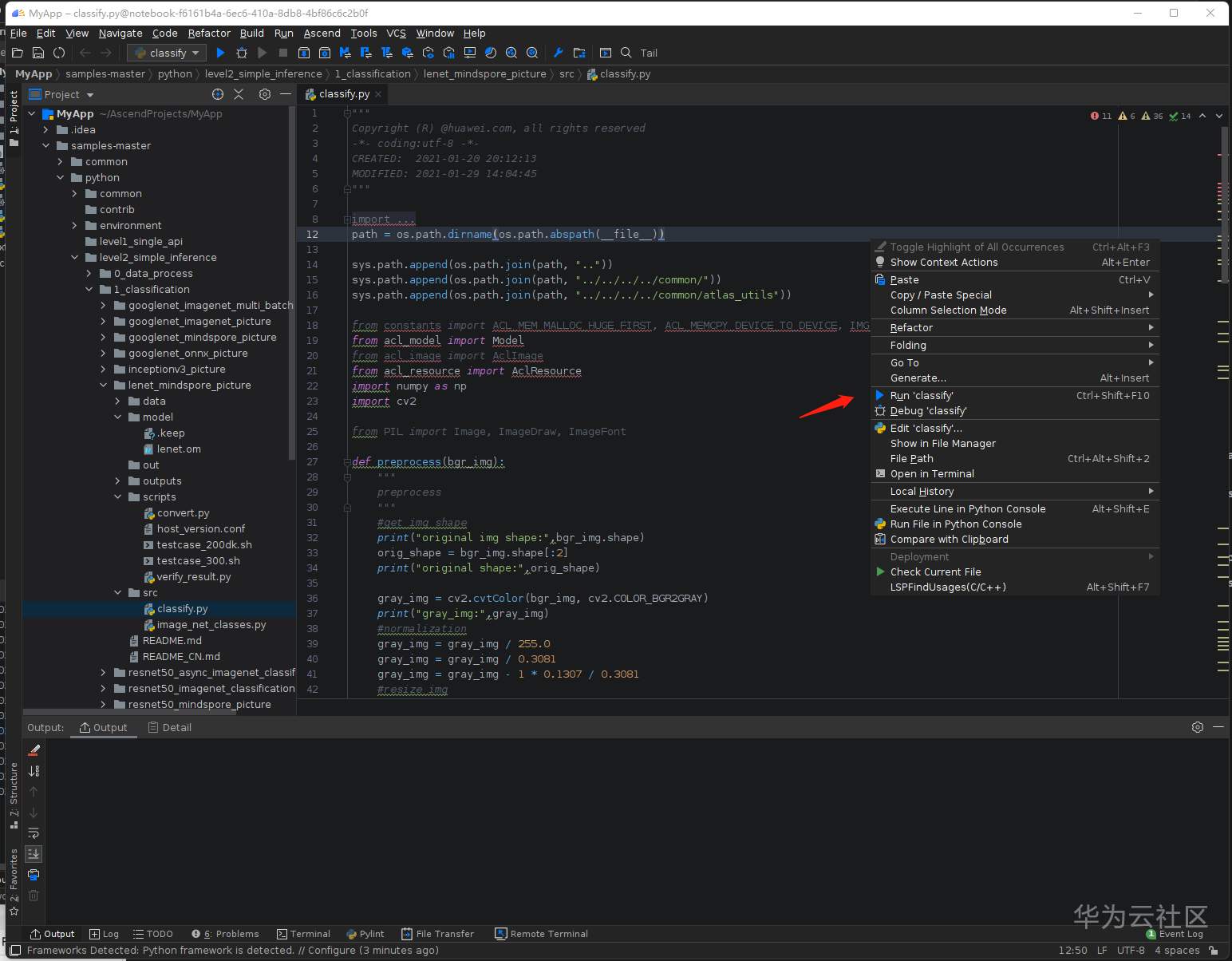 第四步,编写一段AscendCL推理代码,调用上一步生成的om模型进行推理并得出结果。