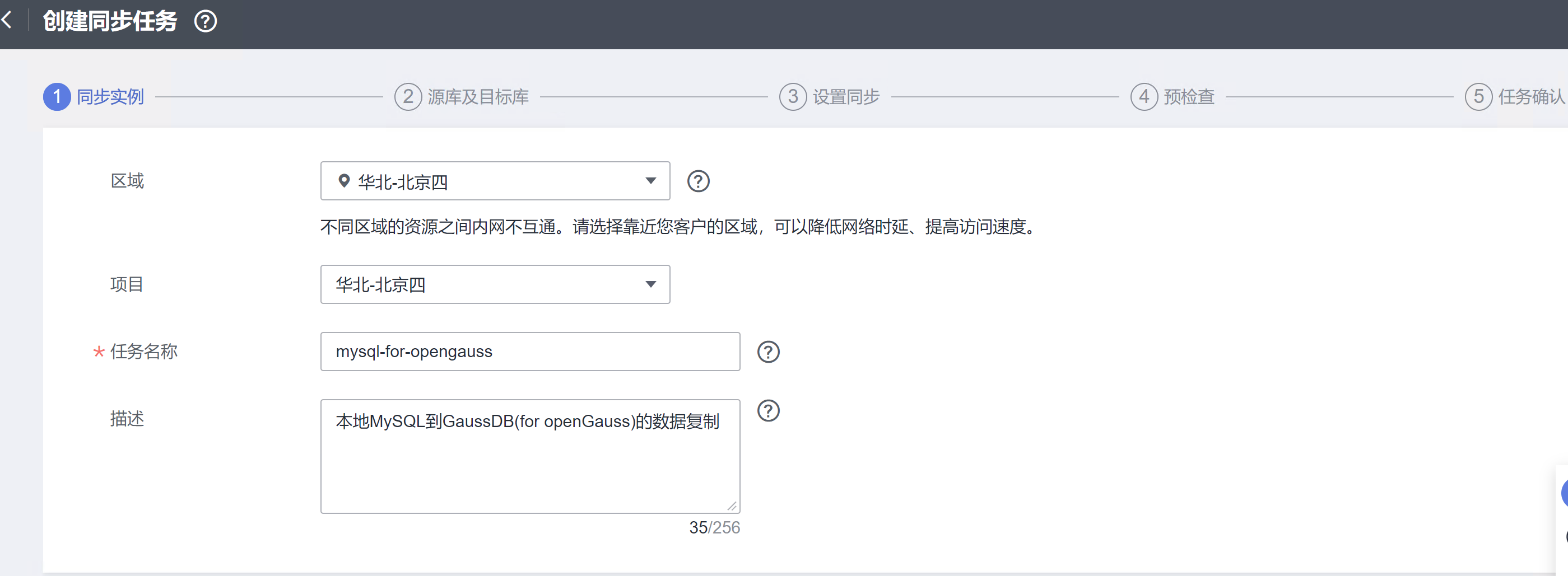 因为此次实验中GaussDB(for openGauss)位于北京四,所以DRS和消息通知服务,同步选了北京四。