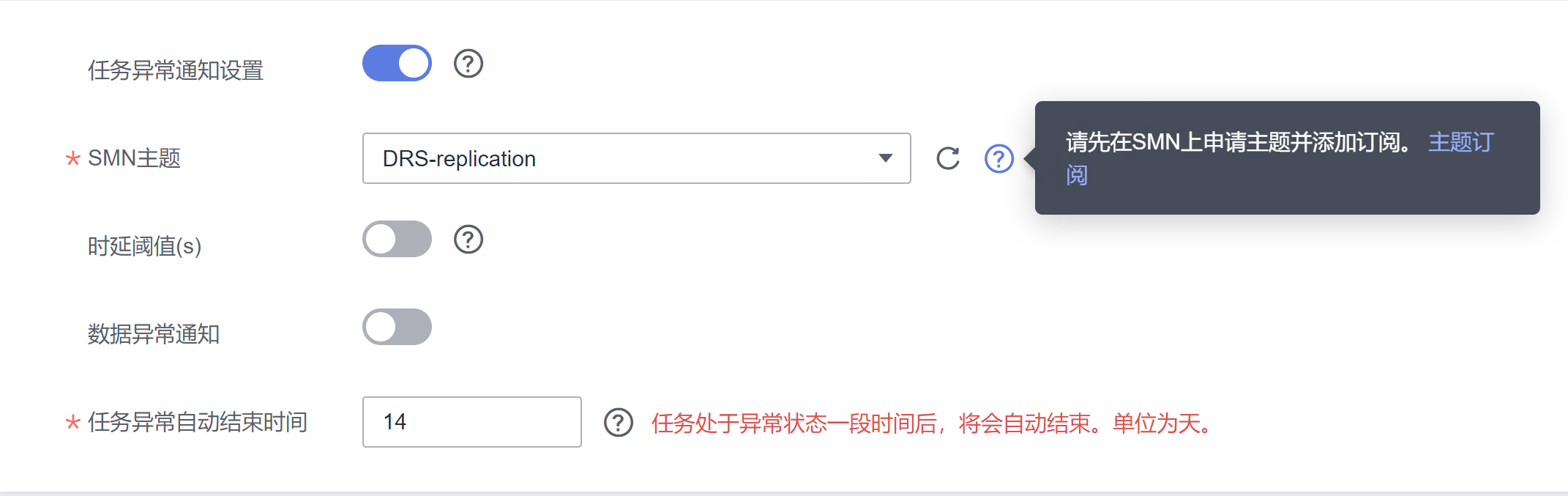 确认订阅后,返回DRS同步任务设置页面,即可在异常通知SMN主题中选到刚刚创建的通知服务了。