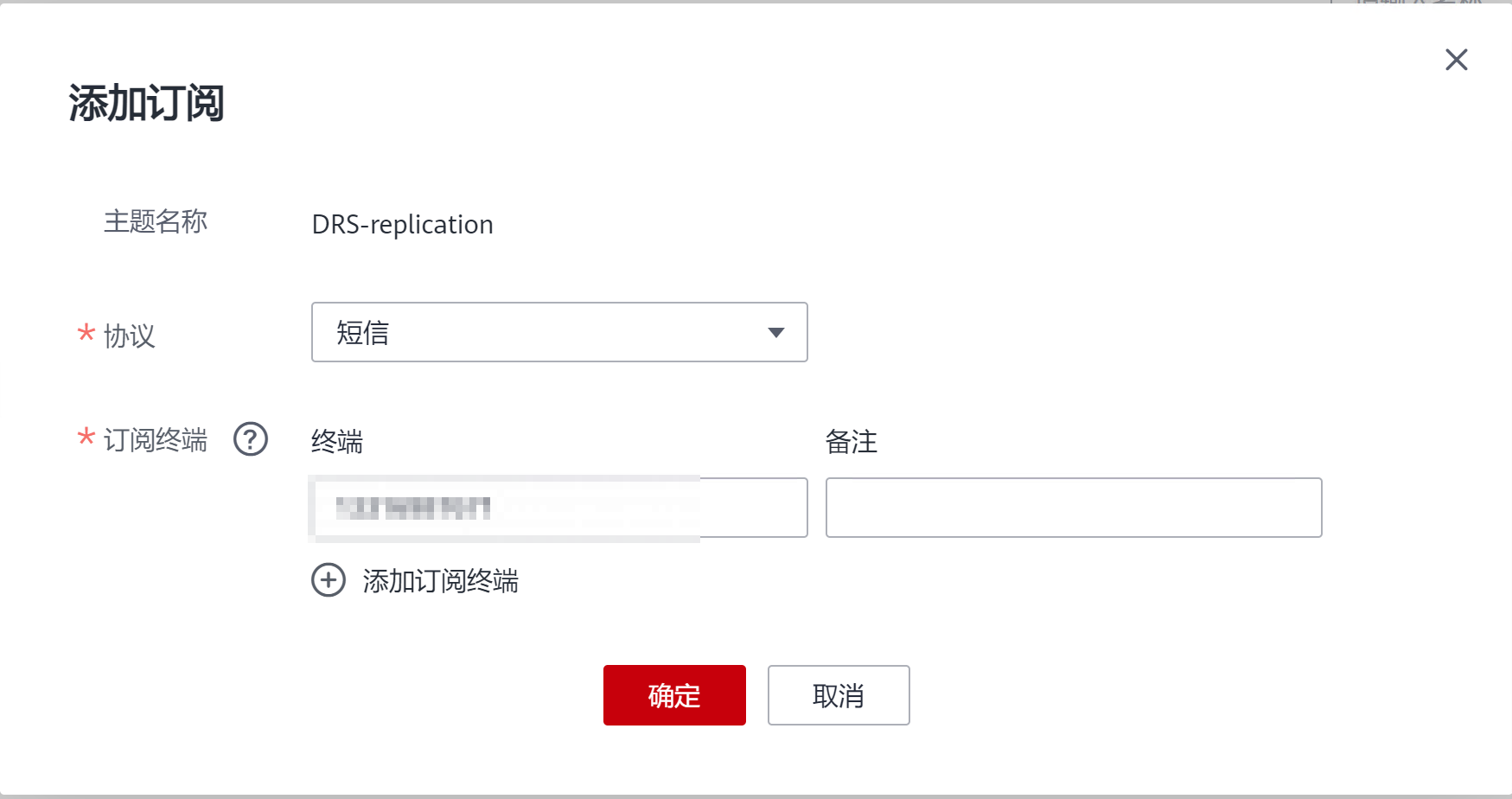 单击“添加订阅”,添加接收消息的短信终端或者邮件终端。
