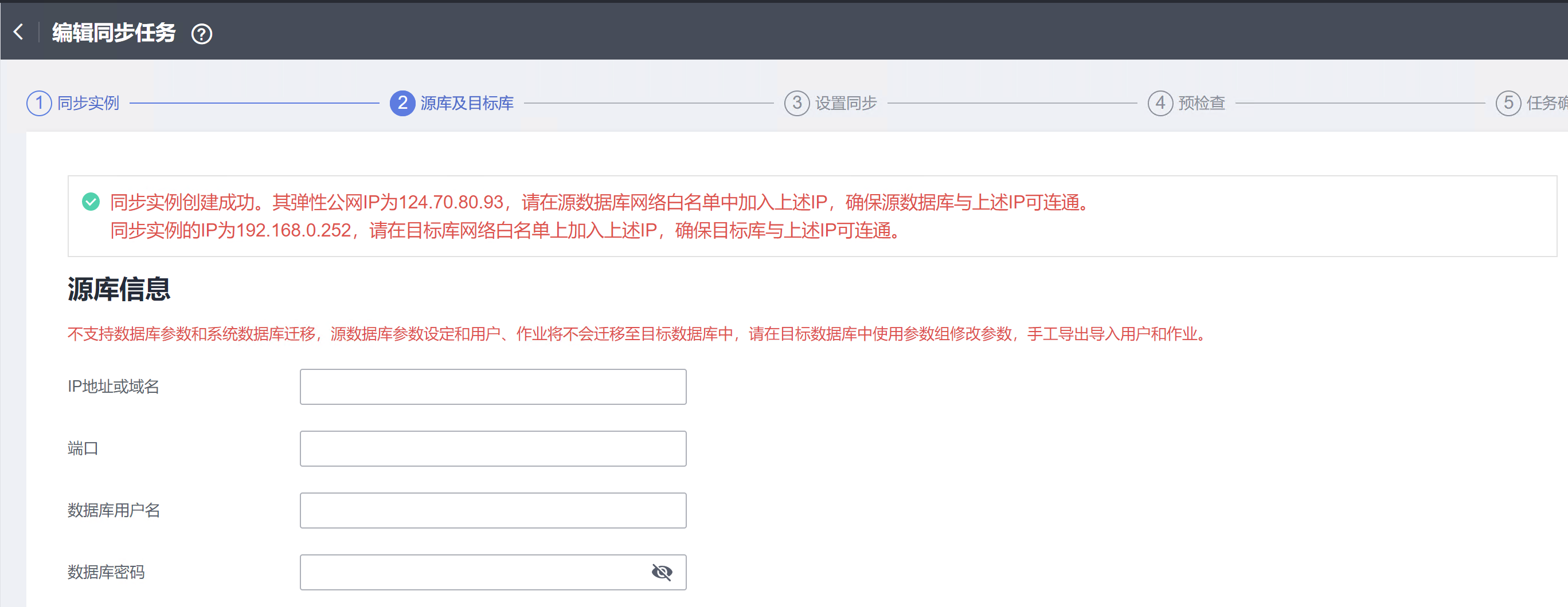 配置完成后,返回DRS同步认为配置页面输入源库MySQL所在ECS的弹性公网IP地址及端口号3306;输入数据库用户名和密码。测试连接,成功后,做目标库的配置,测试连接,成功后,进入下一步。