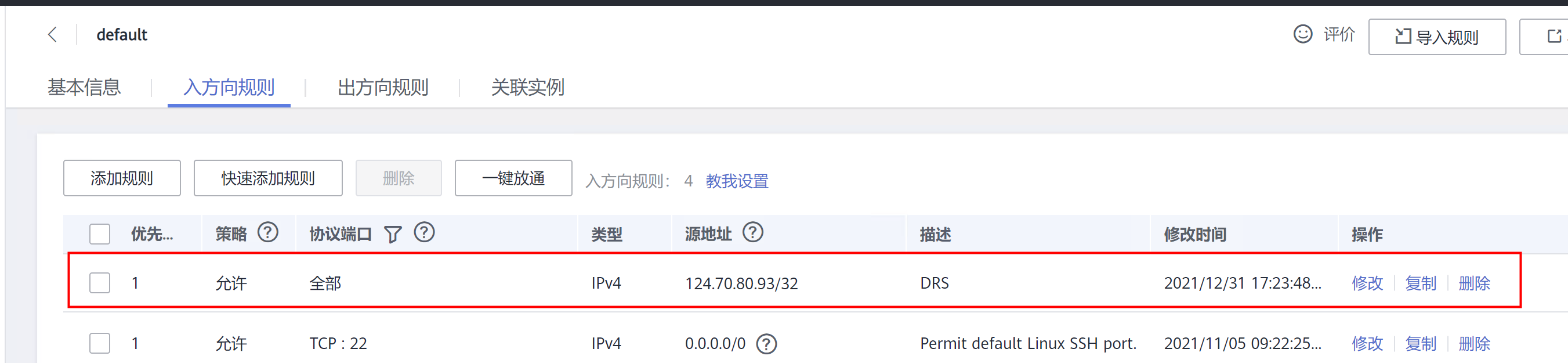 登录华为公有云,配置ECS的安全组出入规则,将DRS的弹性公网IP加入。‘