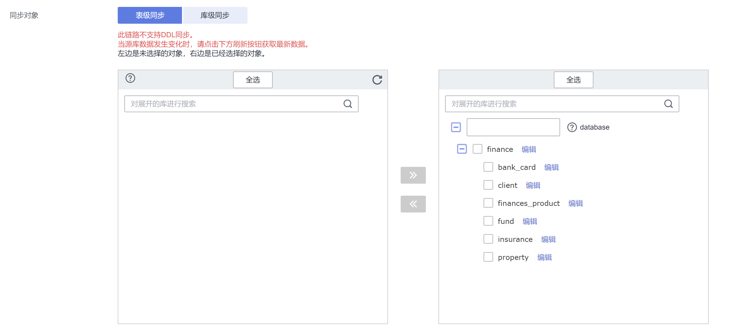 其他保持默认,选择“表级同步”,选择要同步的表加入到右侧,然后单击下一步。