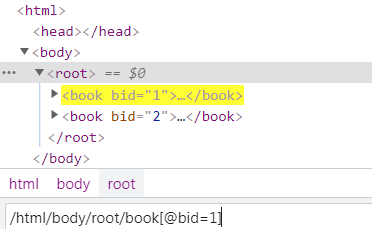 有了根节点概念之后,就可以类别出 . 表示当前节点,.. 表示当前节点父节点。当然还有 @ 可以选择某个属性,例如下述 XPath 表示提取 book 节点中 bid=1 的节点,语法格式如下: