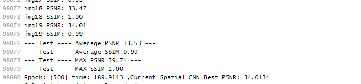 然后讲epoch设置到500,等待他训练完成后他的PSNR值,训练的都能打到34.01,后来进行了test,最终结果33.71
