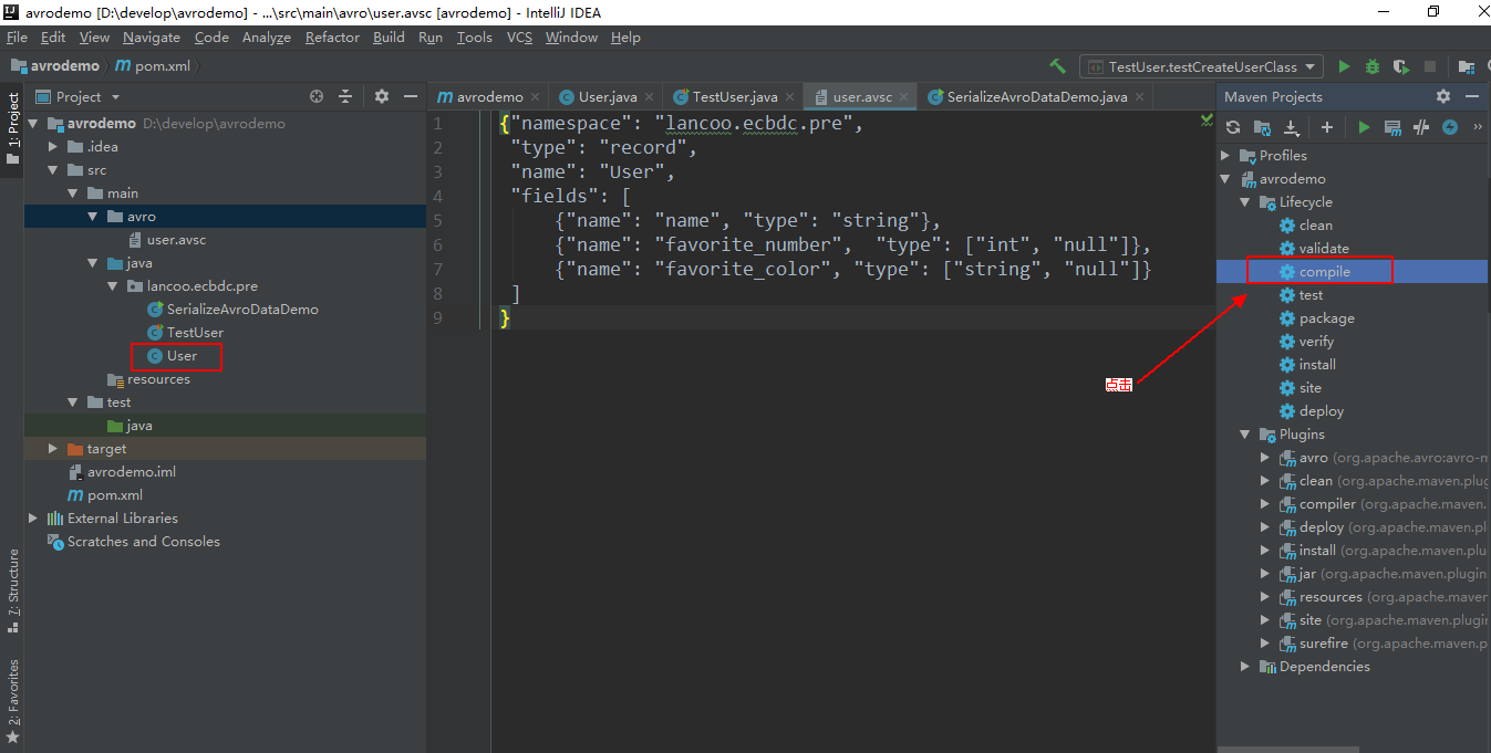 点击maven projects项目的compile进行编译,会自动在创建namespace路径和User类代码