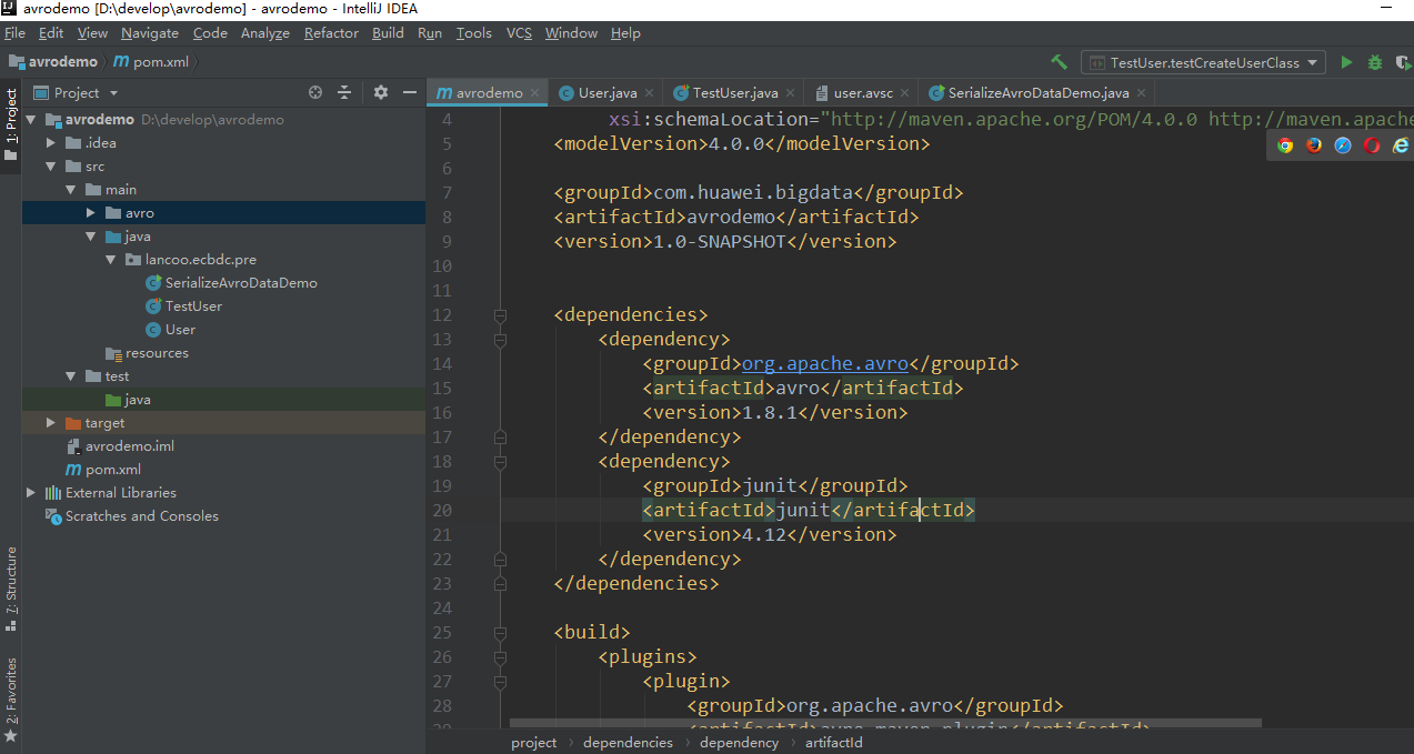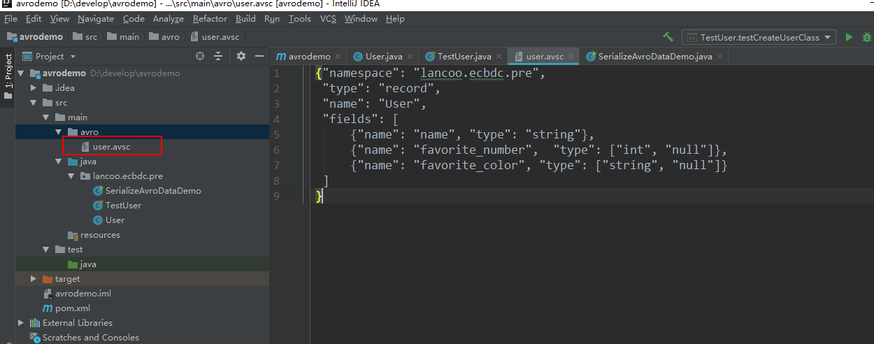 使用JSON为Avro定义schema。schema由基本类型(null,boolean, int, long, float, double, bytes 和string)和复杂类型(record, enum, array, map, union, 和fixed)组成。例如,以下定义一个user的schema,在main目录下创建一个avro目录,然后在avro目录下新建文件 user.avsc :