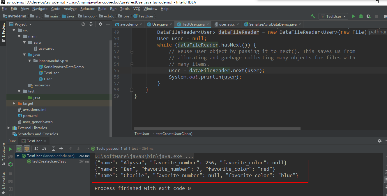 执行反序列化代码解析user_generic.avro