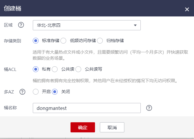 填写完成后,点击右下角的【立即创建】按钮并确认,稍等几秒钟即可完成 OBS桶 的创建。