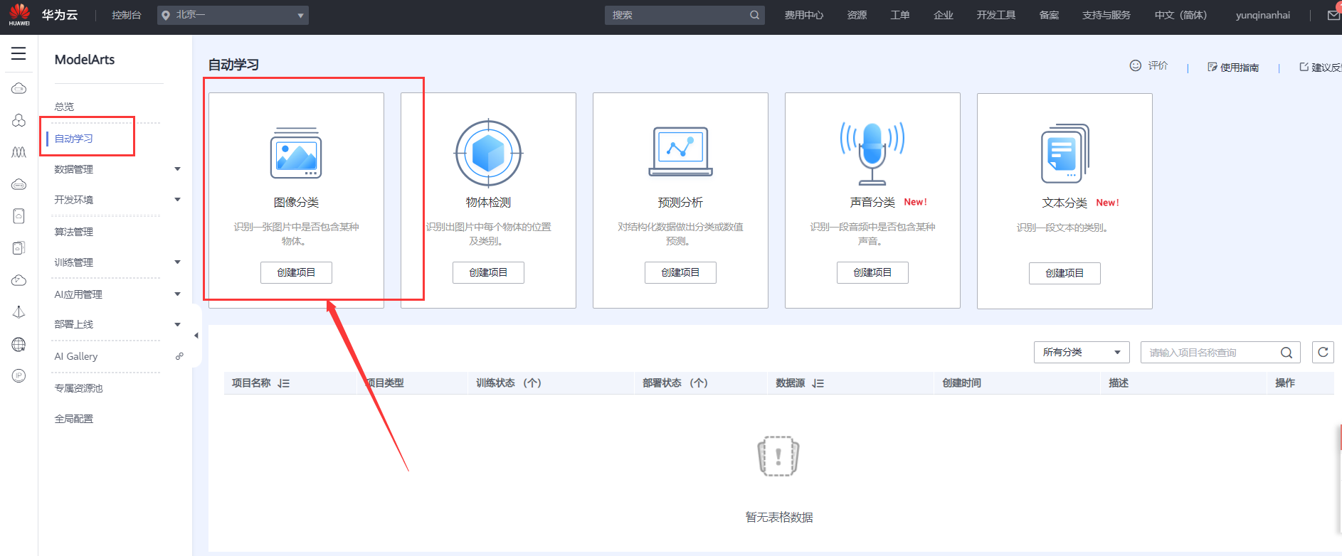 自动学习项目创建