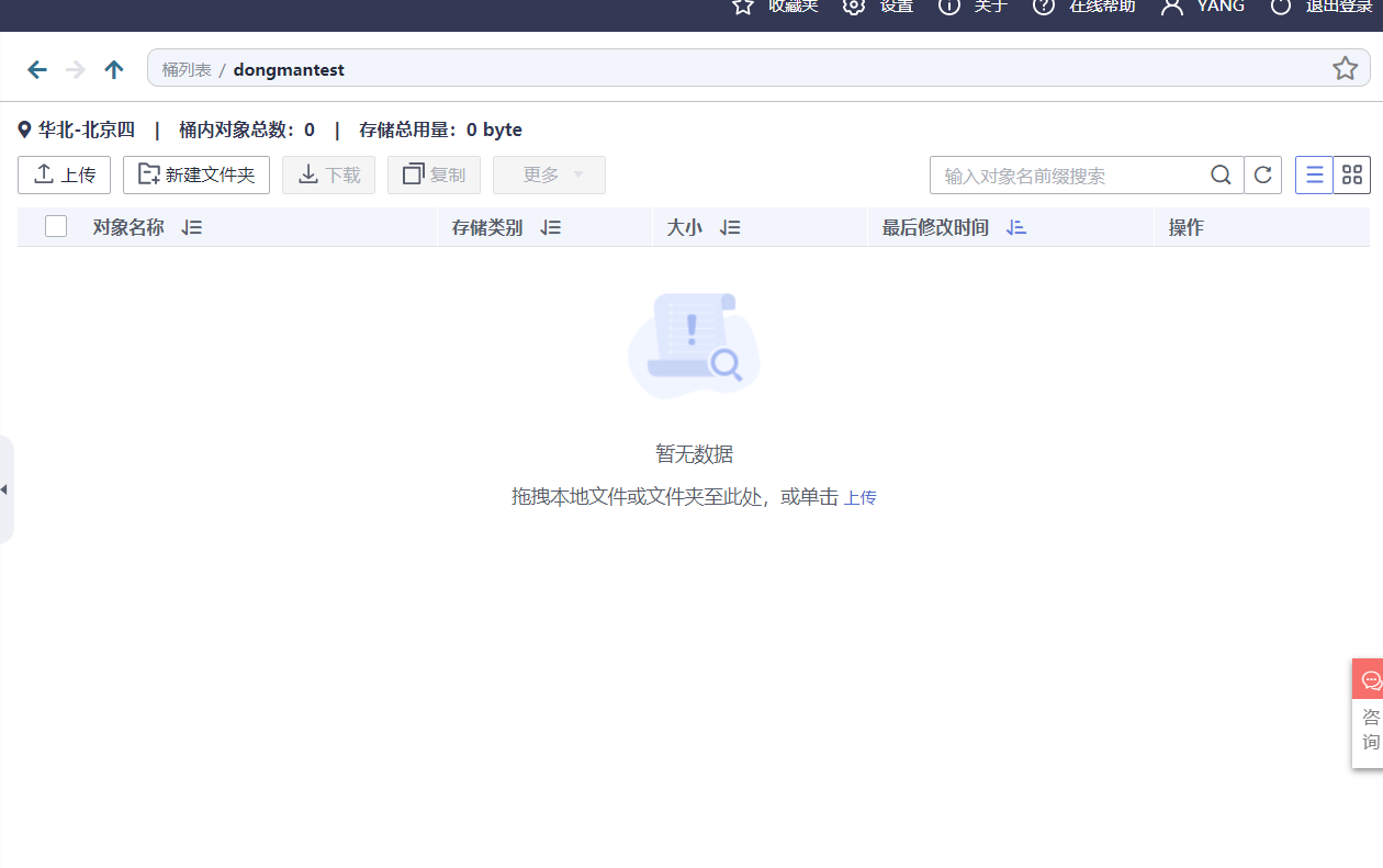 在OBS首页,找到我们刚刚新建的桶,并点击桶名称进入桶内容管理界面。