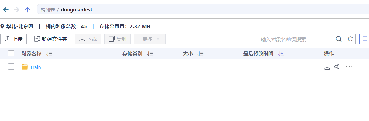进入后,点击左侧【对象】按钮,进入数据上传界面,点击【上传对象】按钮,弹出上传对象框,我们直接用鼠标将前面下载好的 train文件夹 拖拽到到上传对象框内: