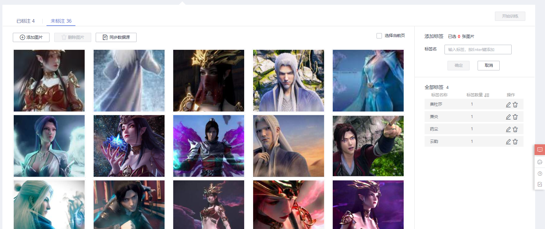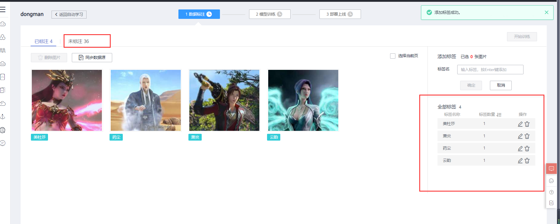 注:标签就是对数据集进行分类,比如本次识别中的:美杜莎、云韵、萧炎、药尘,需我们自己根据数据集新建不同类型的标签;标注就是将数据集中的图片划归到对应的标签下,告诉模型这个图片里是什么