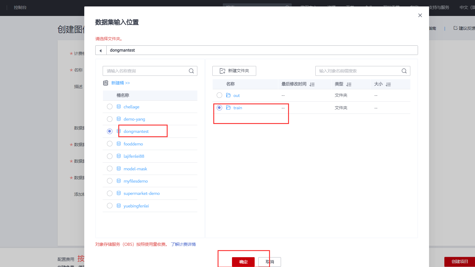 数据集输出位置:选择上一步在OBS创建的的out文件夹