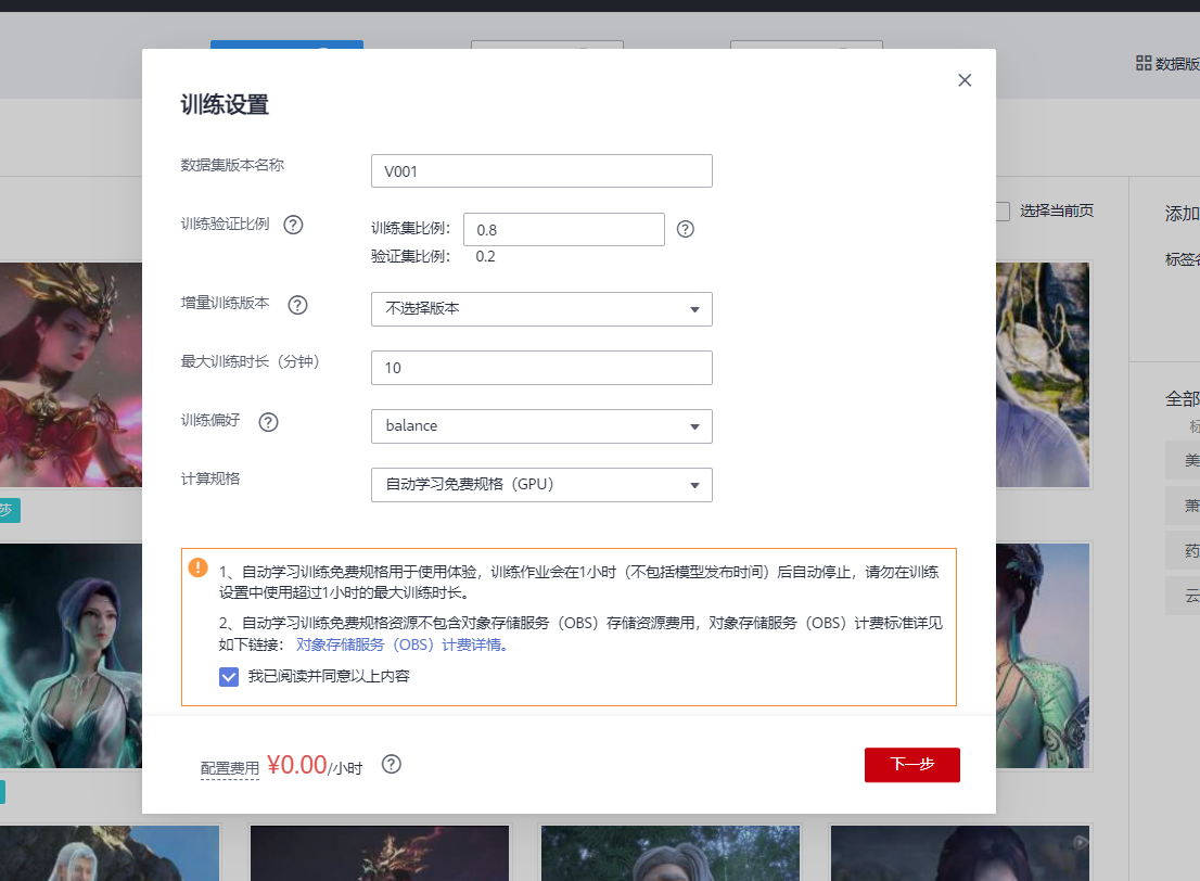 计算规格:选择自动学习免费规格(GPU),并勾选"我已阅读并同意以上内容"