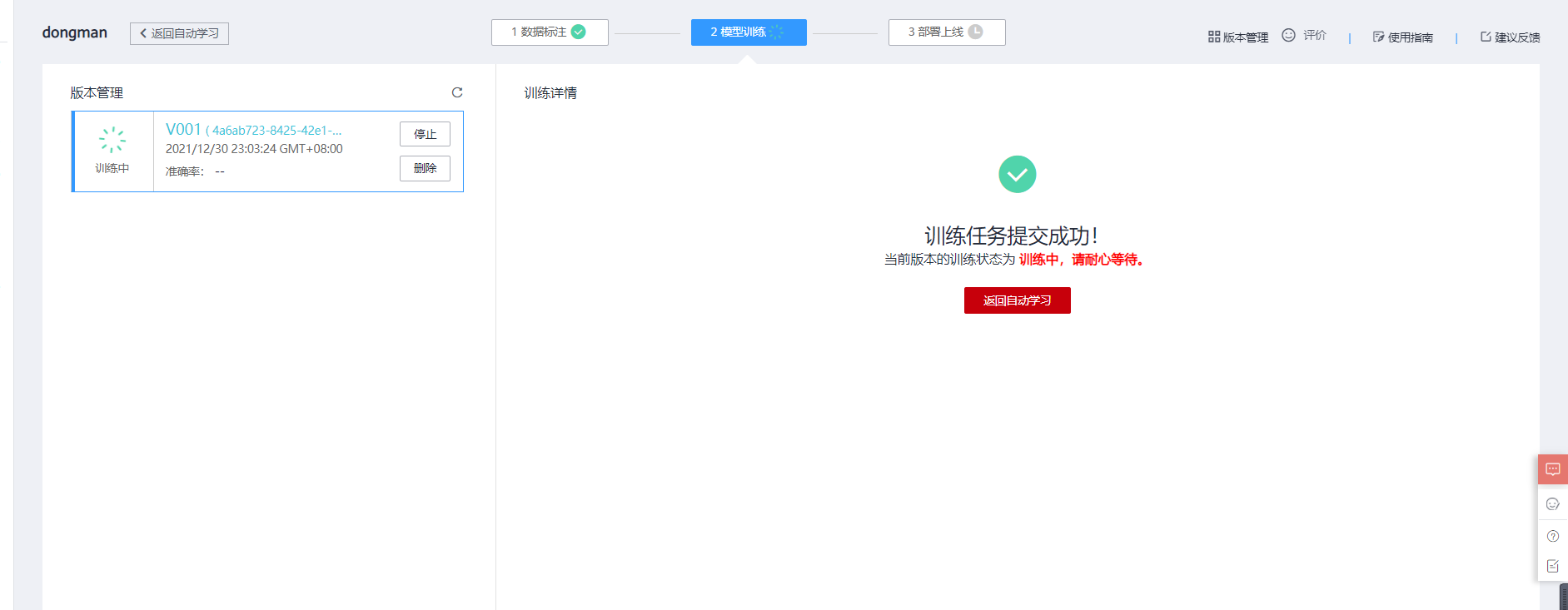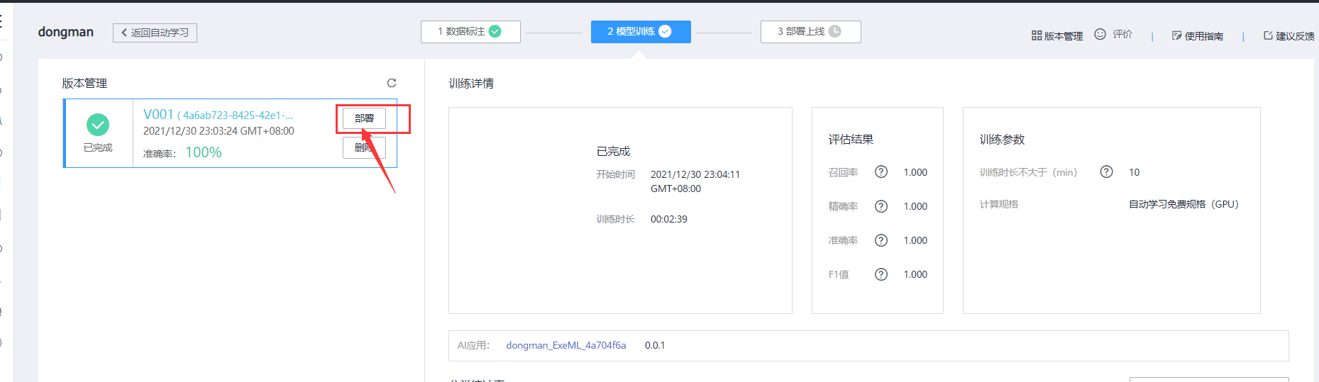 训练完成后,我们点击左侧的部署按钮,进行模型的部署操作,如下图示例。
