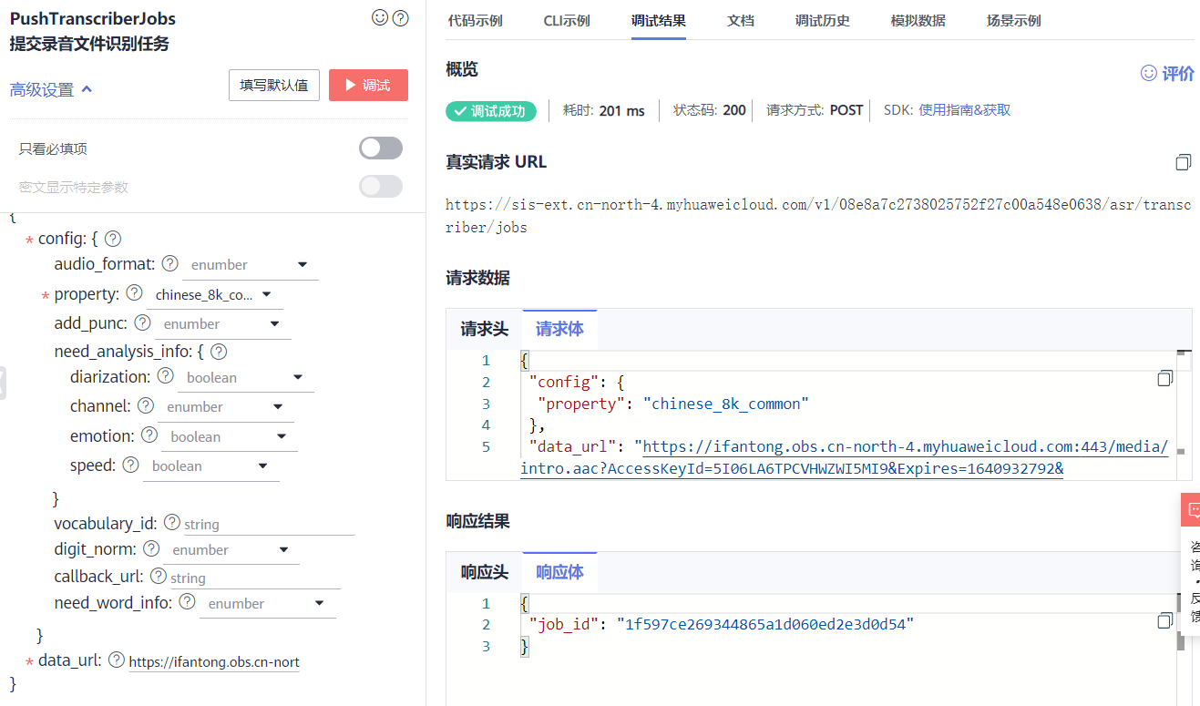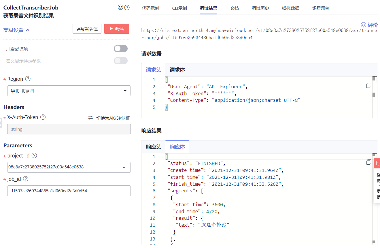 任务已经启动并执行完毕,看右下角的响应体,就是识别结果。有将语音识别为文字的内容,包含了时间、文字,会有多段,所以需要进一步的整理。