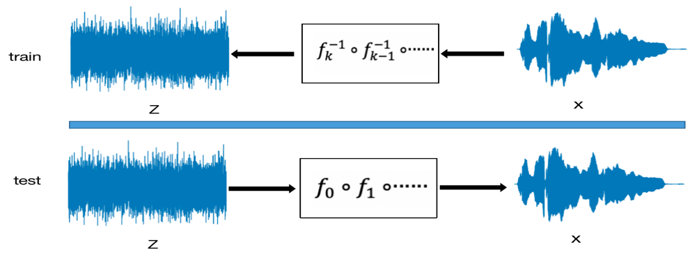 由于自回归神经网络声码器在工业应用中的种种限制,人们开始逐步研究非自回归结构的神经网络声码器。近年,提出很多关于非自回归结构的神经网络声码器,这些声码器通常比自回归模型快几个数量级,因为它们具有高度可并行性的网络结构,并且充分利用了现代深度学习的硬件(GPU和TPU)。现阶段有两种不同的方法来训练这些模型。1)将经过训练的自回归结构的声码器蒸馏成基于卷积的非自回归结构的声码。2)基于流的生成模型WaveGlow。这两种方法都在非自回归神经网络声码器发展上做出了贡献。其中第一种方法训练较为复杂,其比自回归结构的声码器更加难以训练和实施。例如声码器Parallel WaveNet和Clarinet的训练需要两个网络,一个教师网络和一个学生网络,其中教师网络是自回归的结构,学生网络是非自回归的结构。通常需要训练教师网络和学生网络,以让学生网络合成效果无限逼近教师网络,但通常难以成功地训练这些网络使其收敛,因此这种方法难以复制和部署。