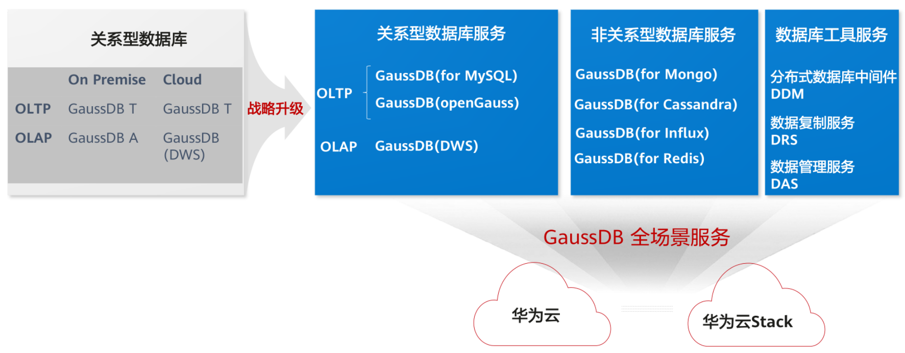 对于关系型数据库,有企业生产交易的 OLTP 数据库和企业分析的 OLAP 数据库。针对 OLTP 应用场景华为推出云数据库 GaussDB(for MySQL) 和 GaussDB(openGauss);OLAP 场景则推出数据仓库服务 GaussDB(DWS)。