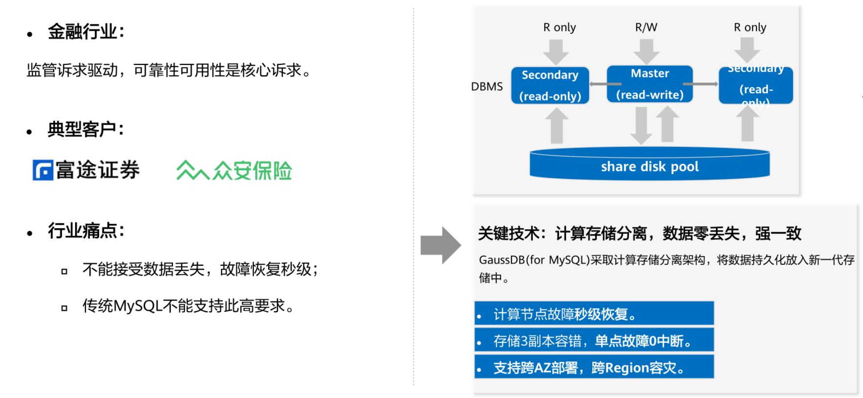 GaussDB(for MySQL) 的极致可靠,数据0丢失,故障闪恢复的优势,解决了金融行业不能接受数据丢失,故障恢复秒级的痛点。