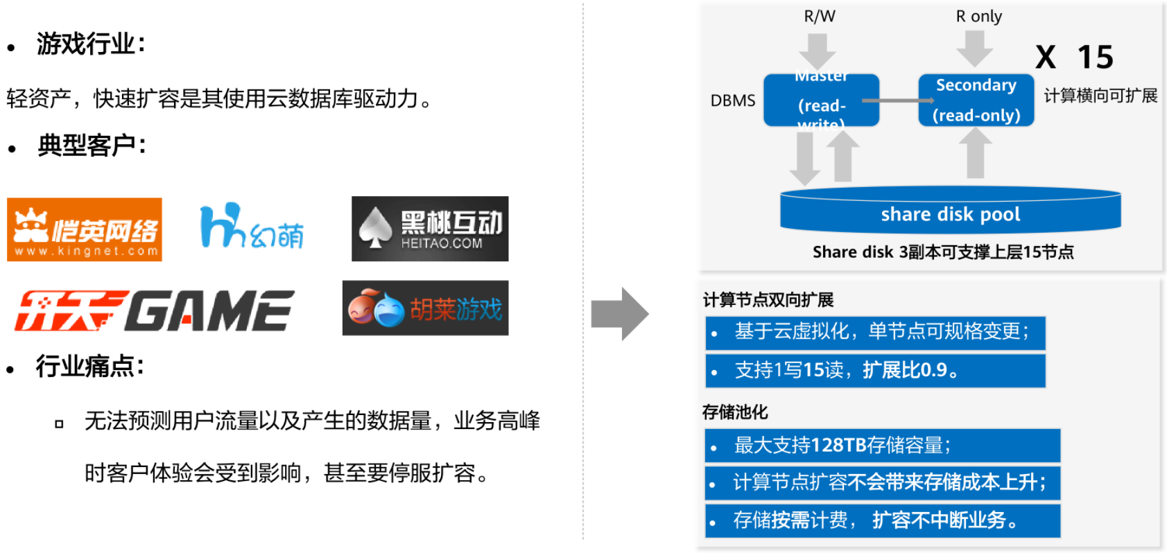 GaussDB(for MySQL) 的多为扩展,海量存储,解决了游戏行业无法预测用户流量以及产生的数据量,业务高峰时用户体验受到影响,设置要挺服扩容的痛点。