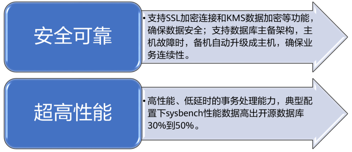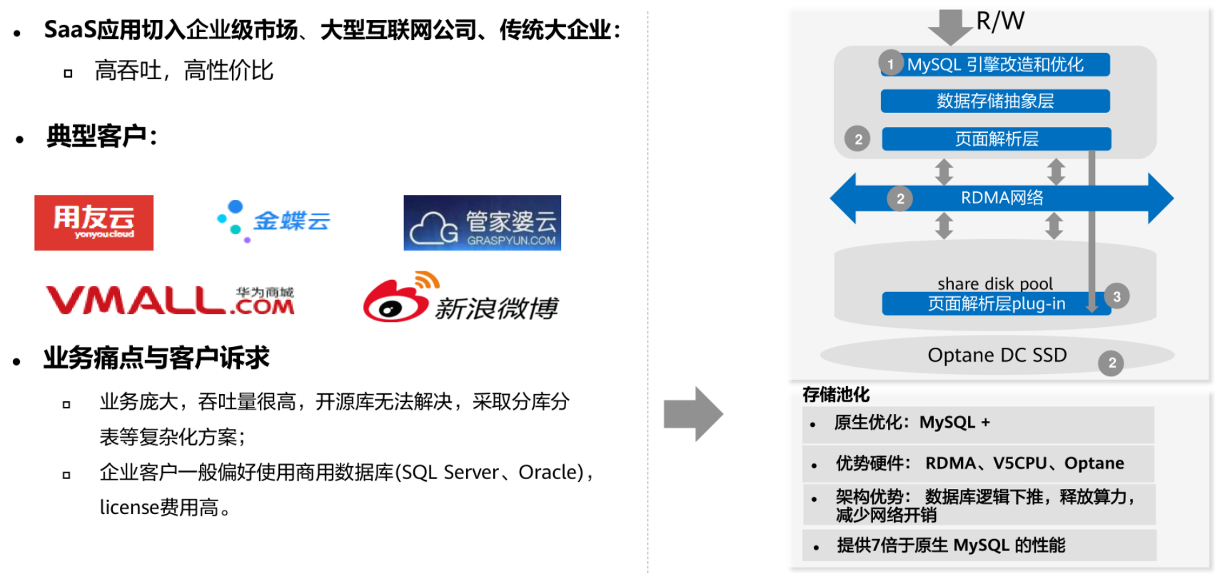 - 创新自研,cloud-native 分布式数据库架构,基于华为最新一代 DFV 存储计算存储分离,保证扩展性价比;数据库逻辑下推存储,最小网络负载,极致性能。