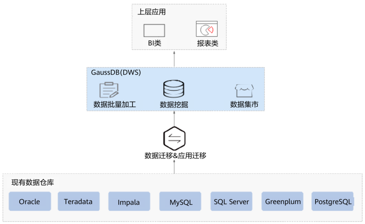 - 提供一键式异构数据库迁移工具:提供配套的迁移工具,可支持 MySQL、Oracle 和 Terdata 的 SQL 脚本迁移到 GaussDB(DWS)