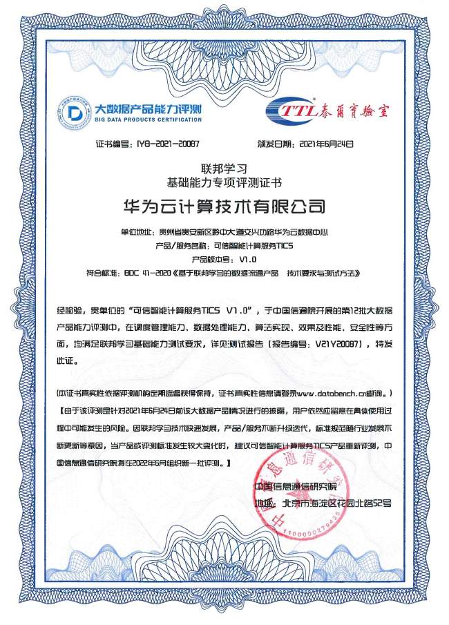 可信智能计算TICS通过信通院《联邦学习》基础能力专项评测