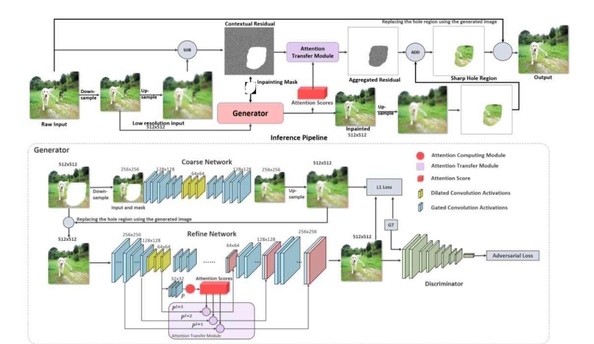 先由粗糙网络Coarse network,产生粗略的缺失内容(图像的大体轮廓),然后由精细网络对改内容进行精细修复。