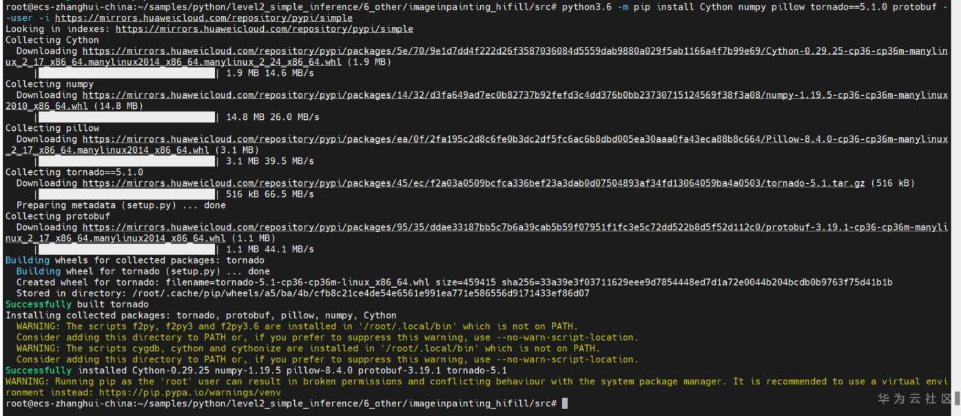 python3.6 -m pip install Cython numpy pillow tornado==5.1.0 protobuf --user -i https://mirrors.huaweicloud.cn/repository/pypi/simple