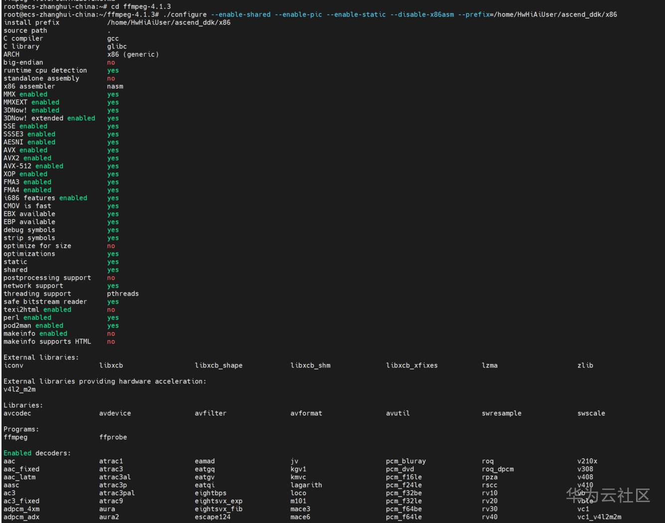 ./configure --enable-shared --enable-pic --enable-static --disable-x86asm --prefix=/home/HwHiAiUser/ascend_ddk/x86