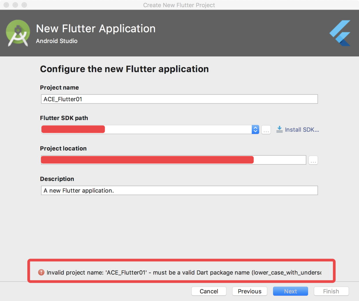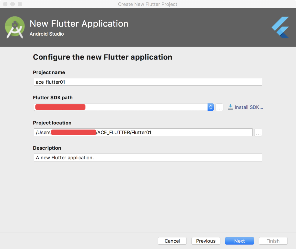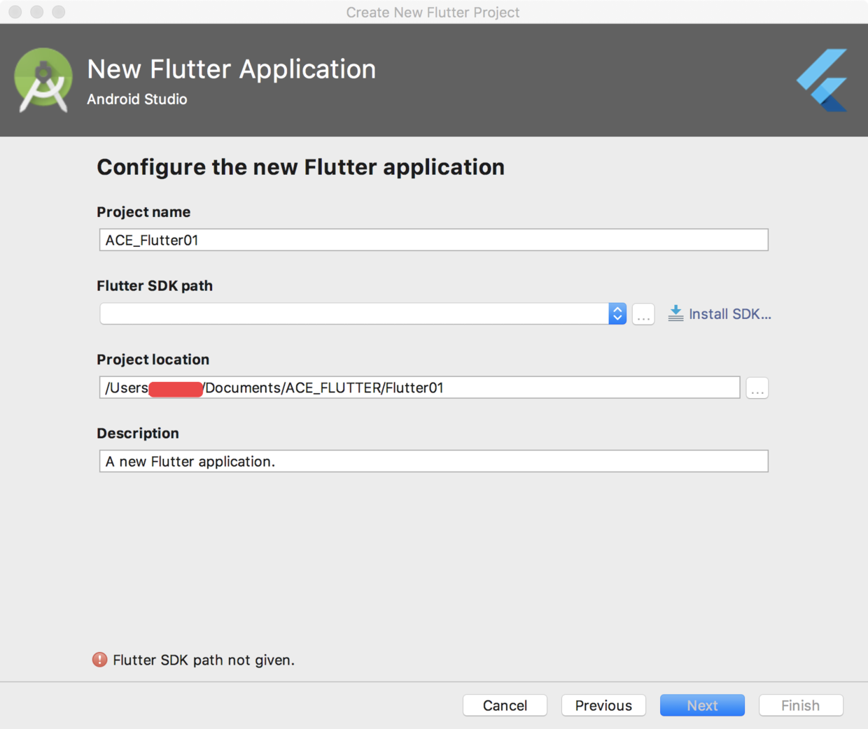 正常情况下,填写好项目名称和项目路径即可,但是小菜这里提示 Flutter SDK path not given,如图: